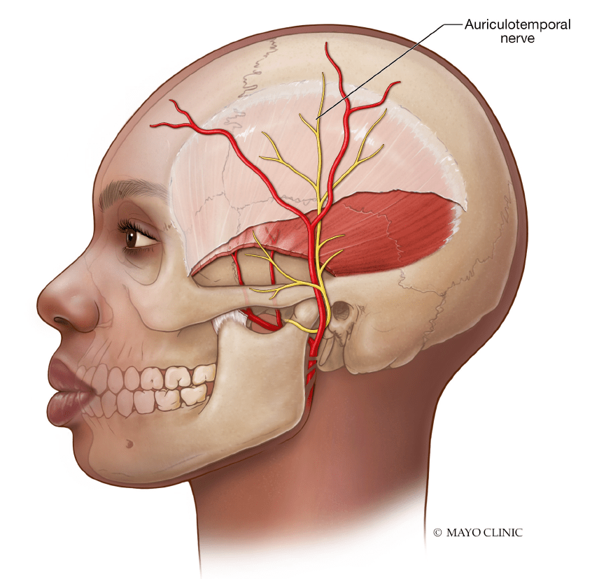 • Auriculotemporal Nerve (ATN): Located near the temple, used for headaches involving the TMJ and ear region.